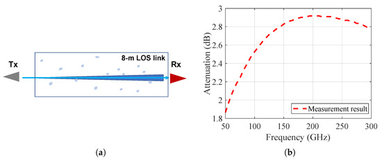 Because of the existence of a few studies on the attenuation caused by snow, the ITU-R does not provide a computational method for prediction of such attenuation. In our work, we use the measurement data from [20]. As shown in Figure 2a, the 8-m LOS path was measured under a significant snowstorm condition. The Tx was located under an overhanging roof, and the wave directly propagated through the snow to the Rx. The attenuation magnitude was measured in the frequency range of 50–300 GHz, as shown in Figure 2b. The measurement data shown in Figure 2b can be converted in terms of the unit (dB/km). For instance, the attenuation caused by snow at 300 GHz is 2.8 dB/8 m or 350 dB/km. Thus, the for each ray and each frequency point can be calculated with the corresponding travel distance d of each ray as follows: