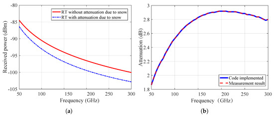Validation of ray-tracing (RT) with attenuation caused by snow. (a) RT result vs. RT result with the attenuation caused by snow; (b) comparison between the measured attenuation magnitude (red dot curve) and post-processed RT results (blue curve).