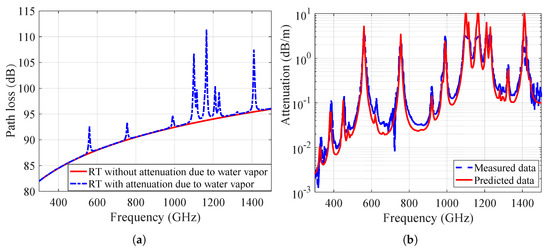 Then, we simulate a 1-m LOS path in the frequency range between 300 GHz and 1500 GHz with a sub-frequency wideband of 5 GHz (totally 241 frequency points), and add the attenuation caused by water vapor with 70.84% relative humidity. The water vapor absorption is calculated using parameters from HITRAN. We refer to the prediction method from [21] to post-process the RT result. As can be seen from Figure 4a, the red curve is directly calculated with free space path loss by RT simulator and the blue curve is the post-processed RT result with the attenuation caused by water vapor with 70.84% relative humidity. In order to observe the change of attenuation value due to water vapor itself with frequency, we removed the free space path loss in the simulation results, as shown in Figure 4b. Moreover, in order to compare with the measured data more clearly, we change the natural coordinate into the semilog coordinate. The mean absolute error between measurement data and simulation data of 241 frequency points is 0.403 dB. This means that the predicted method of the attenuation caused by water vapor can adequately reproduce the measured results. Therefore, the RT engine, as well as the processing steps to add the attenuations, can adequately reproduce the channel measurements under the specified meteorological conditions.