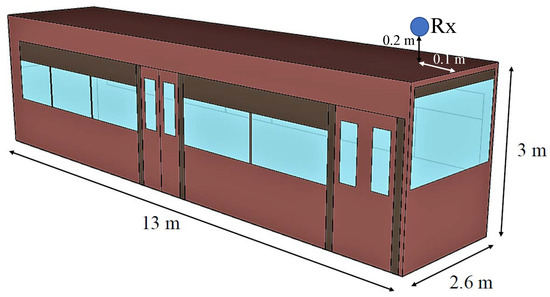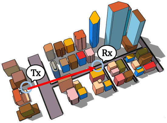 In this study, the RT simulation is based on the reconstructed three-dimensional (3D) scenario model with calibrated EM parameters at 300 GHz. The EM parameters of the relevant materials were calibrated in our previous work [24,25] and are summarized in Table 1. In the table, and are the real and imaginary parts of the relative permittivity, respectively; S and are the scattering coefficient and exponent for the directive scattering model. As shown in Figure 5, the 3D urban scenario was reconstructed using SketchUp and based on OpenStreetMap (OSM). The Tx is located at the end of the target urban street at a height of 5 m, whereas the Rx antenna is placed on a moving bus at a height of 3 m, as shown in Figure 6. In this study, the Tx and Rx were both omnidirectional vertically polarized antennas with antenna gain of 0 dBi and transmitted power of 0 dBm. The configuration of the antenna was aimed at simulating a pure propagation channel and ignoring the influence of the antenna patterns. Based on the pure propagation channel, various antenna patterns and beamforming approaches can be coupled with similar scenarios. The simulated city was Seoul, with a longitude of 127.05 E and latitude of 37.583 N. The rainfall rate exceeded 0.01% of a year on average () and was determined as 60.72 mm/h.