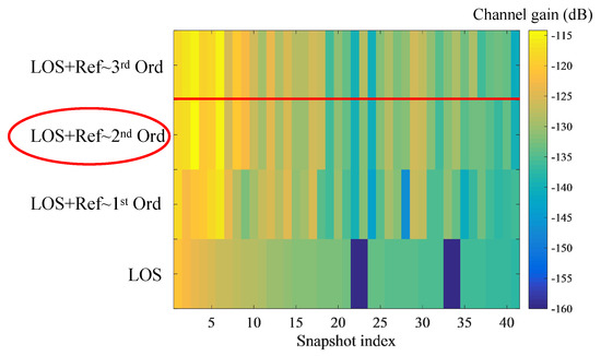 In addition, the order of reflection determines the accuracy and computational complexity of the RT simulation. Consequently, appropriate reflection orders should be selected for different scenarios to balance the computational time and accuracy. An exploratory simulation was conducted to decide the highest valid reflection order in this urban scenario. As shown in Figure 7, the LOS ray and reflection rays up to the 2nd order contribute almost all of the total channel gain. The running time for each snapshot is 10.9 s. Compared with the channel gain of the LOS ray and up to 3rd order reflection rays, the difference is very slight. However, the running time for each snapshot is much longer (918.2 s). Therefore, reflection rays up to the 2nd order alone are adequate to study the propagation channel in this urban scenario. The simulation configurations are summarized in Table 2. More details can be found in [26].