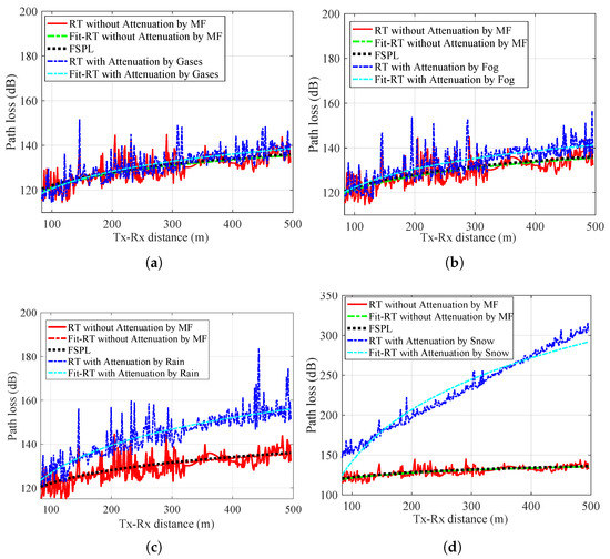 Path loss, (a) by Gases; (b) by Fog; (c) by Rain; (d) by Snow.