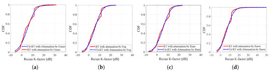 where KF represents the Rician K-factor, and and represent the electric field amplitude and phase of the mth ray, respectively; denotes the number of rays, and is the electric field vector of the strongest ray. Figure 9 shows the K-factors and fitting results of all the attenuation factors. The mean value of the K-factor for the RT results without considering the meteorological factors is 5.25 dB, which indicates effective multipath components (MPCs) reflected and scattered from the surrounding infrastructures, buildings, and ground. Compared with the realistic scenario in Seoul, in most cases, office buildings in a city have smooth glass facades. Therefore, strong reflections will occur at these glass surfaces, and the RT simulation results substantiate this point well. When considering the different meteorological factors in the order of atmospheric gases, fog, rain, and snow, the mean values of the Rician K-factors increase correspondingly. These results are consistent with the findings that the reflected or scattered rays travel farther than the direct rays under LOS condition and suffer more attenuation as well. Therefore, the values of the K-factor become larger.
