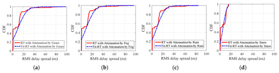 RMS (root-mean-square) delay spread, (a) by Gases; (b) by Fog; (c) by Rain; (d) by Snow.