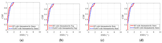 ESD (elevation angular spread of departure), (a) by Gases; (b) by Fog; (c) by Rain; (d) by Snow.