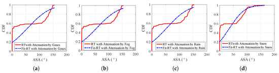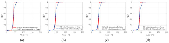 ASA (azimuth angular spread of arrival), (a) by Gases; (b) by Fog; (c) by Rain; (d) by Snow.
