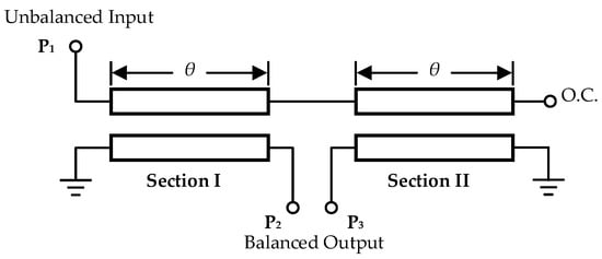 Figure 1 shows the schematic of the conventional Marchand balun, which consists of two identical coupled line sections, where a single section coupler with electrical length of θ, is shown in Figure 2, and its four-port S-parameter matrix can be represented by Equation (1), as given in [13].