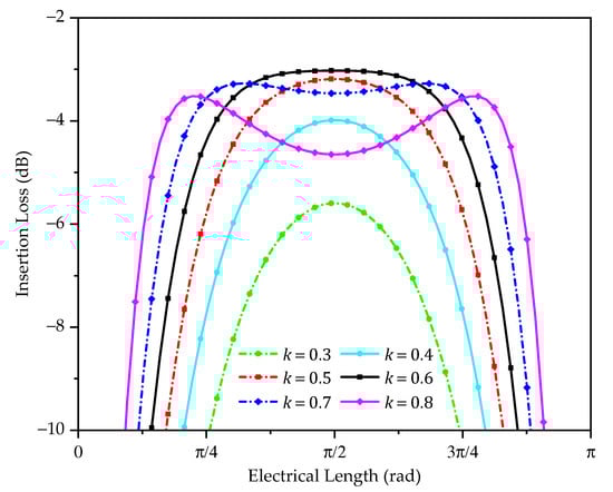 Plot of insertion loss versus the coupled line electrical length θ, for different coupling coefficient .