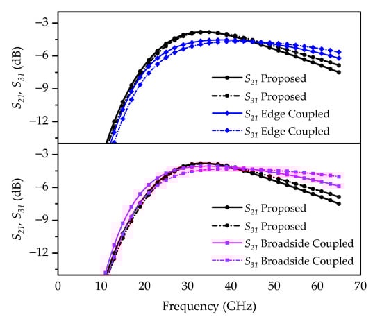 where , and . Therefore, increases as increases. Compared with the edge-coupled structure, where either or exists, or the broadside-coupled structure with only mutual capacitance , using the proposed edge- and broadside-coupled hybrid configuration, a higher can be obtained, hence maximizing coupling .