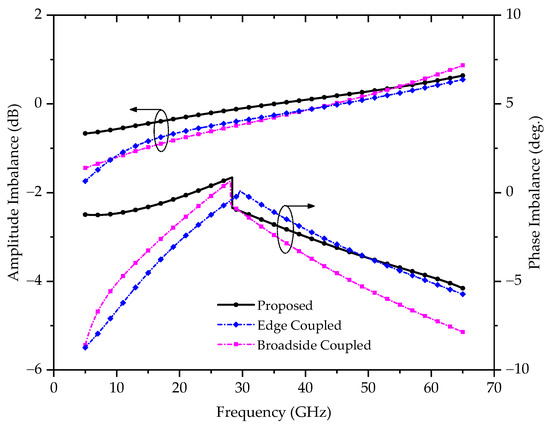 From Figure 8, it can be seen that the proposed balun shows significant improvement over the conventional edge-coupled and broadside-coupled structures in terms of amplitude/phase balance, where the amplitude and phase imbalance are −0.18 dB to 0.20 dB and −3.23° to 0.81°, respectively across a 1-dB frequency bandwidth.