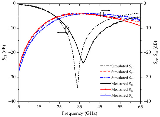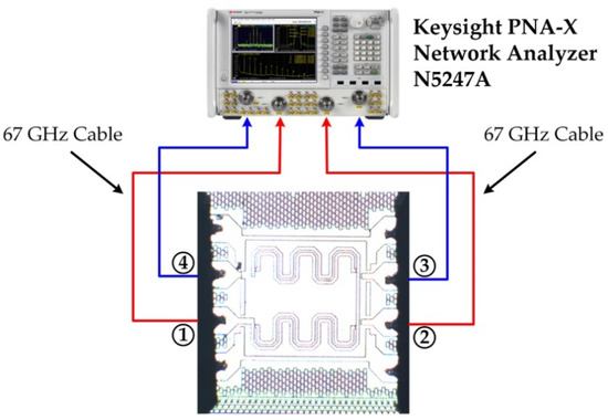 The proposed balun is fabricated using the IHP 0.13-μm SiGe BiCMOS process with a core size of 270 μm 280 μm. The on-wafer measurement is carried out using the Keysight PNA-X network analyzer N5247A (Keysight, Santa Rosa, CA, USA) with a four-port Hybrid Line–Reflect–Reflect–Match (LRRM) and Short–Open–Load–Thru (SOLR) calibration. The measurement setup and die photo is shown in Figure 9. A minimum insertion loss of 1.02 dB with a 1-dB bandwidth of 29.0 GHz to 46.0 GHz is measured, as shown in Figure 10.