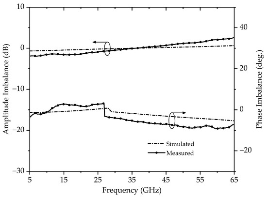 Figure 11 shows the simulated and measured amplitude and phase imbalances. A ±0.83 dB amplitude imbalance and −3.8° to −7.3° phase imbalance is measured across the band from 29.0 GHz to 46.0 GHz. The small difference between the simulated and measured data is primarily due to the imbalance introduced between the output differential ports during the calibration phase. In addition, the measured frequency shift is due to the process variation of the capacitor C1.