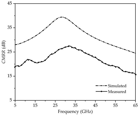 Common mode rejection ratio (CMRR), defined as the ratio between the differential-mode insertion loss over the common-mode insertion loss as shown in Equation (10), is plotted in Figure 12. CMRR more than 25 dB has been measured for the proposed hybrid structure. The difference between simulated and measured data is due to higher amplitude and phase imbalance, as the CMRR is dependent on the amplitude and phase balance of the balun. Poor amplitude or phase balance will result in higher common-mode signal pass through and, thus, low CMRR.
