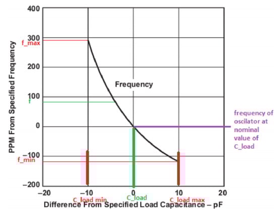 Another source of frequency drift is the crystal capacitive loading mismatch. The effective load of a PCB mounted crystal depends on the external loading capacitance tolerance, the PCB parasitics, and the oscillator circuit parasitics. The difference from the load capacitance specified by the manufacturer can lead to an error up to ±200 ppm [27], which introduces a further delay of ±100 min/year at its maximum. Probably, this is the most important error source, so the design phase is very crucial; a typical characteristic is shown in Figure 1.