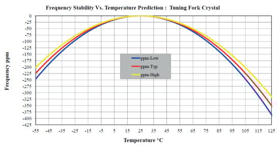 The last source of inaccuracy is represented by the temperature changes that, for quartz, have a trend represented by a parabola whose vertex is the so-called turnover temperature (TOT). Figure 2 shows the graph for crystal ABS07-32.768KHZ-9-T [28] from Abracon (Spicewood, TX, USA) used in the project. In this case, the turnover temperature is around 25 °C. The effect is that the oscillator slows down when the temperature changes around the TOT. It is important to underline that the drift could be significant. Let us consider a 55 °C temperature; the frequency drift is about ±26 ppm which means a delay of about ±13 min/year.