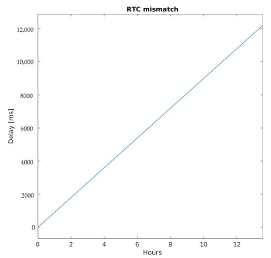 We compared the performances of the RTCs of two identical boards for a 14 h log at a constant temperature of 30 °C. As expected, the mismatch grows linearly and at the end of the observation interval it is around 12 k milliseconds, as shown in Figure 3. That means a total mismatch between the boards of about 238 ppm; that is a delay of about 119 min/year.