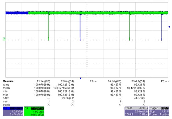In order to show this clock diversity, we use two identical units with a sampling frequency of 100 Hz and the interrupt feature enabled. The output pin is active low and is triggered as soon as the processor reads the data. In Figure 4 it can be noticed that the mismatch is about 57 mHz, while the time needed for the processor to read the data is about 80 s. This means that the measured frequency differences should be attributed only to the frequency clock tolerance, which is about ±2% for the IMU used [34], and to the internal delays.