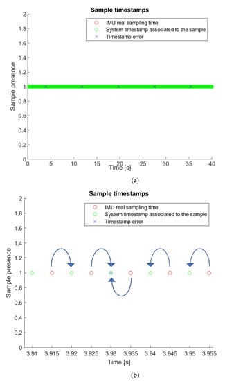 As a consequence, it cannot be used as a reference time generator, creating a serious problem. In fact, let us consider the measured IMU clock of 100.12712 Hz as in Figure 4 and an ideal system clock with a resolution of 10ms. In such a situation, every sample from the IMU is associated with a system timestamp. Nevertheless every 7.88 s there is ambiguity and two samples are associated with the same timestamp. The situation is shown in Figure 5. Instead, if the measured clock is smaller than the ideal system clock, we have sampling events without a sample.