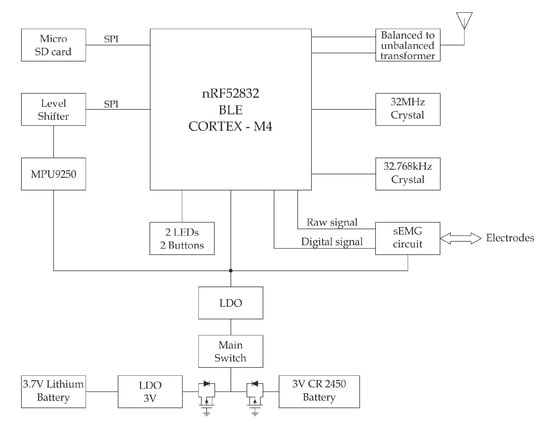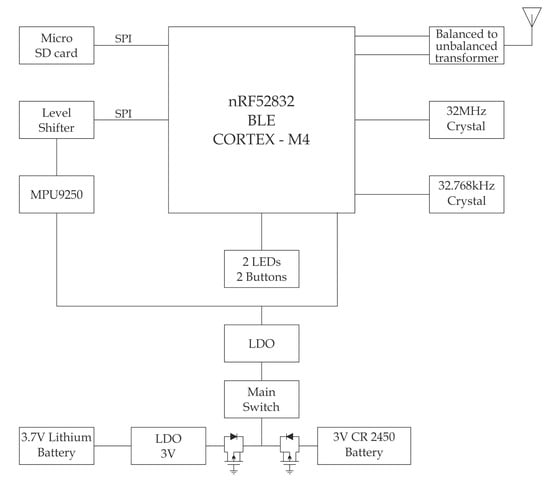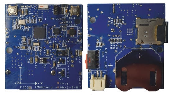 The custom designed IMUboard-HW-1-0-0 allocates a nine degrees of freedom (DoF) MPU-9250 nine-axis MEMS MotionTrackingTM device from TDK-InveSense (San Jose, CA, USA). The MPU-9250 integrates on the same chip, the TDK-INV 6-axis IMU MPU-6500 and the AKM magnetometer AKM-8963 mutually connected using the AUX-I2C of the MPU-6500 [34]. The angular velocity ranges from ±250 (deg/s) to ±2000 (deg/s), while the measurement range of the acceleration is from ±2 (g) to ±16 (g). The measurement range of the magnetometer is about ±4800 (uT), the sampling rate is up to 8 kHz, and the communication clock frequency is up to 20 MHz for the Serial Peripheral Interface (SPI) reading protocol. The system core is the Nordic Semiconductor (Trondheim, Norway) SoC nRF52832 that integrates a 64 MHz ARM®CortexTM-M4 CPU with 512 kB Flash memory and 64 kB RAM. The SoC manages a multiprotocol Bluetooth 5, ANT/ANT+, and proprietary 2.4 GHz. The processor uses a micro SD card for data logging and it communicates with it in SPI bus mode using the FAT32 file system to allow direct download of the data onto a PC. The user interface uses a couple of LEDs (green and red), two push-button switches for user interaction, and one main power switch. Finally, the power is supplied to the entire system either with a CR2450 coin cell battery, using a proper battery holder on the board, or with an external battery, using the JST connector on the board. The IMUboard-HW-1-0-0 unit is depicted in Figure 6 and the block diagram shown in Figure 7 depicts its structure.