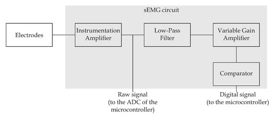 Figure 10 shows the circuit block schematic of the sEMG. The first stage is a differential instrumentation amplifier with a gain of about 300 V/V. Its output can be routed to the ADC of a processor to analyze the raw data. The second stage is a rectifier block. The signal, then, is fed to a low-pass filter (LPF) with a cut-off frequency at 3 Hz to suppress the rapid muscle contraction. The fourth stage is an amplifier with a variable gain controlled by the processor to equalize the signal amplitude coming from different quality electrodes or different muscles. The final stage is a comparator whose digital output is sampled at 50 Hz by the microprocessor and indicates that there is muscle activity. The sampling frequency used for the sEMG is independent of the IMU sampling frequency. In fact, two different threads are used for acquisitions and writing takes place on two different files. It is important to underline that each measurement is referenced over time, thereby allowing the correct temporal location of the stored measurements.