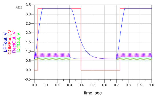 The circuital simulation performed in Keysight Advanced Design System (ADS) is reported in Figure 11. This circuit allows one to monitor the muscle activity and trigger a specific action without using the microprocessor resources.