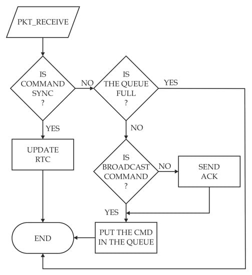 As stated in previous sections, the greatest non-deterministic synchronization artifact is represented by . The firmware should be organized while striving to reduce the elaboration time of the synchronization packet received by the slaves. The flowchart of the packet reception routine is illustrated in Figure 13 where it can be noticed that the synchronization packet is immediately processed.