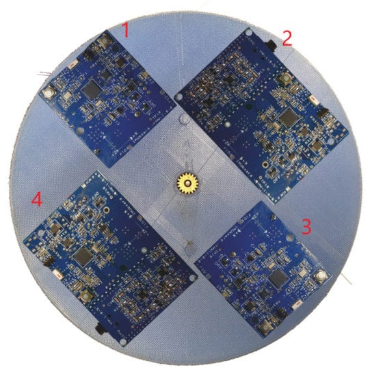 The first setup is shown in Figure 14 where a total of four slaves, two IMUs, and two sEMGs, were mounted on a rotating platform. A microcontroller drives a stepper motor that rotates the disc according to very specific routines quasi-randomly alternating movements and pauses.