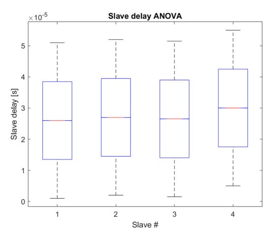 Figure 15 reports the analysis of the variance (ANOVA) of the delays for each slave. To that end, the firmware has been modified, lowering the RTC resolution to 10 s and introducing a routine for memorizing the time difference between the local and the received timestamp. The test lasted 24 h. The figure evidences that the error distribution is comparable for the four slaves used, its mean value being around 25–30 s, and the 25th and 75th percentiles are about 15 s and 40 s, respectively. The reported results demonstrate that the proposed system can be used in applications with much more stringent synchronization requirements.