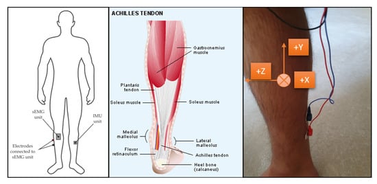 Units placement, achilles tendon area detail, electrode placement, and IMU orientation.