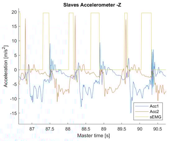 In this configuration, one sEMG unit (slave 1) was placed on the tibia of the right leg and one IMU unit (slave 2) on the tibia of the left leg; the IMU orientation for both legs is shown in Figure 17. The electrodes were positioned, as an exercise, as in Figure 17 to analyze the relationship between muscle activity in the area of the Achilles tendon rather than that of a single muscle. Finally, the master is worn by the user in his pocket. For sake of clarity, an extract of the elaborations made on the data of a walk of a healthy individual during a 24 h logging of his daily activities will be reported and discussed below.