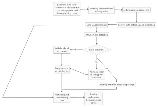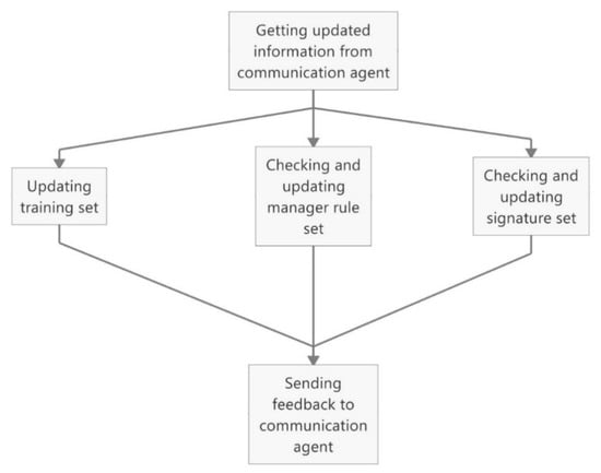 The contract class contains all the business logic of the communication process. Permissions and validations are defined. They are related with specific communication messages the communication agent can send to other specific communication agents and determine when this communication action can be valid. Communication agents can only trigger the communication function by using this smart contract. Because this contract only regulates communication agents, other agents that have new functions and are under control of communication agents can still be added to or removed from the system. The contract is only used to secure communication between communication agents within the management layer, to maintain both security and scalability. When the detection and analysis module is started, blockchain will be initialized. Block genesis and communication will be saved in the blockchain and the blockchain will be saved in the local host and broadcast to other modules. The reason why this blockchain is initialized by the detection and analysis module is because this module is the core module of the system. The type of communications that can be sent and saved is decided by the Contract. Smart contracts can only be edited by system managers before initialization. They cannot be changed once the system is initialized.