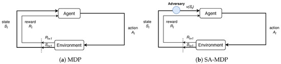 In SA-MDP [27], an adversary is introduced shown in Figure 1b. The role of the adversary is to perturb the observation of the agent, such that the action is taken as , however, the environment still transits from state s rather than to the next state. Since may be different from s, the agent’s action from may be sub-optimal, and thus the adversary can reduce the reward earned by the agent. In practical control problems, the uncertainty of measurement or state estimation is often reflected as the noise in the worst case. In order to model the uncertainty of measurement of the UAV, we assume that the error between the measured value and the real value s satisfies the small disturbance constraint, so we restricted to choose the value inside the ball containing s. Formally, is assumed, where is a small set of states, and is a set of task-specific “neighbouring” states of s.