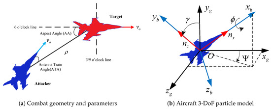 In real WVR aerial combat scenes, both aircraft maneuver at the same time; therefore, one aircraft will be located at the tail of the other aircraft. This ensures stable locking on the other party, and therefore, the opponent aircraft finds it challenging to get rid of the lock, and then attack the different plane. The combat geometry and parameters shown in Figure 2a are employed.