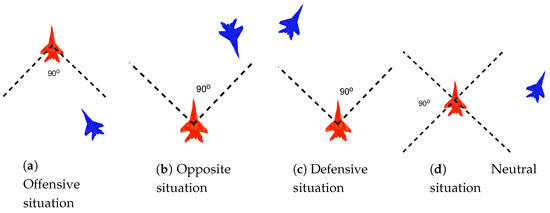 As can be seen from Figure 2a, a smaller value of means that the attacker is more accurate at aiming at the target, so is inversely proportional to the shooting chance or offensive advantage. Similarly, a smaller indicates a lower probability of being hit by the target; therefore, is inversely proportional to the survival advantage. A termination condition of WVR aerial combat and rewards can be designed through the above-mentioned quantitative analysis of the aerial combat objectives and related parameters. The reward function can be designed using Equation (21) as follows: