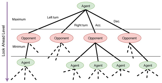 In this paper, the maneuver strategy of the target is designed using the Minimax Search Tree method (MST). The MST method simplifies and models the combat engagement between two players as a chess-type tree, a model-based method. See the schematic plot in Figure 6. The MST idea models the aircraft to following certain predefined candidate maneuvers. The candidate maneuvers include seven actions: max load factor left turn, max load factor right turn, max long acceleration, steady flight, max long deceleration, max load factor pull up, and max load factor pull over.