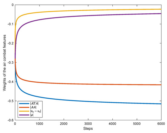 Each component of the aerial combat features defined in Table 2 is divided into 20 parts on average, and each component of the action space is divided into five parts on average. Gradient descent method is used to solve in Equation (42), and the learning rate is 0.01. The initial weight is set to −0.25.