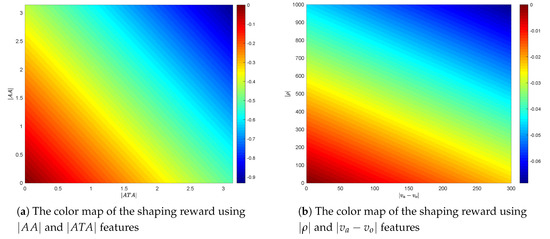 In order to quantitatively determine the effects of the four features of the aerial combat on the total shaping reward, the color map of the shaping reward using and features and the color map of the shaping reward using and features are respectively drawn in Figure 8a. In Figure 8b, the influence of and on shaping reward is far greater than that of and on shaping reward. Therefore, it is more important to have the advantage of a relative angle than the advantage of relative distance and speed in aerial combat, especially in short-range aerial combat.