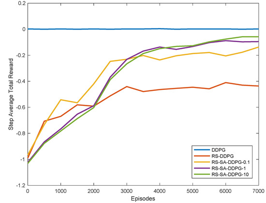 In this section, a comparative analysis of the training methods is performed. The five training algorithms are the DDPG algorithm without reward shaping (DDPG), the DDPG algorithm with reward shaping (RS-DDPG), the SA-DDPG algorithm with reward shaping, and the learning rate in Equation (33) is set to 0.1 (RS-SA-DDPG-0.1), the SA-DDPG algorithm with reward shaping and the learning rate is set to 1 (RS-SA-DDPG-1), and the SA-DDPG algorithm with reward shaping and the learning rate is set to 10 (RS-SA-DDPG-10) to training the aerial combat maneuver strategy.