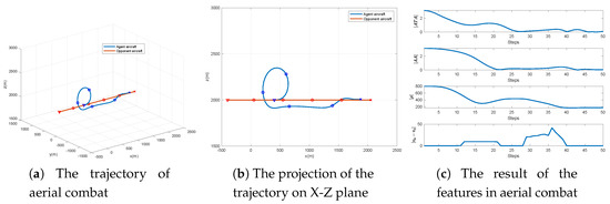 The results of the simulation scenario against the uniform linear motion maneuver strategy are presented in Figure 10. The trajectories are depicted at intervals of 1 second. The downward-pointing triangle points at the trajectory represent the initial position. The cross points at the trajectory represent the end position of the aerial combat and, the circular points are marked every 10 s. To gain the situational advantage in aerial combat, the attacker performs a somersault maneuver to allow the target to overshoot it for about 30 s quickly. Then, the attacker speeds up to catch up with the opponent and, finally, slows down to prevent overshoot and steadily tracks the target. As a result, the target was successfully destroyed in 50 s by gunshot. It can also be seen from Figure 10 that the overall features of the attacker relative to the target increases from the initial positive value to zero, and there are some oscillations in the middle, but in the end, it can be stably maintained at zero, i.e., in an advantageous situation.