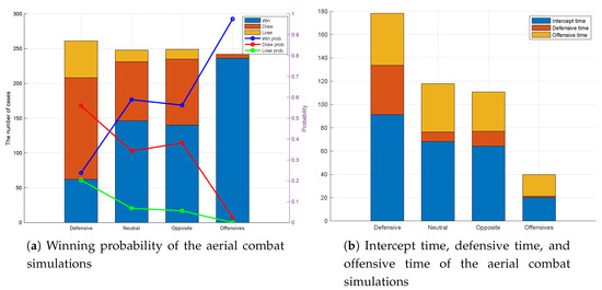 To quantitatively and accurately analyze the intelligence degree of an aerial combat strategy, this study proposes four metrics: intercept time , defensive time , offensive time , and winning probability . Intercept time is measured from the aerial combat simulation’s beginning until an aircraft has a position of advantage. The position of advantage is the termination condition of the aerial combat, expressed in Equation (21). Defensive time is when a UCAV is at during aerial combat. Offensive time is when a UCAV is at during aerial combat. The winning probability is the ratio of aerial combat simulations and the total number of aerial combat simulations.