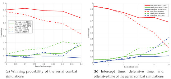 The result of the experiment is shown in Figure 13. Firstly, the robustness of the airial combat strategy on the perturbation range of observation error is analyzed. In Figure 13a, when the perturbation range is 0, the winning rate of aerial combat strategies obtained by RS-SA-DDPG-1 and RS-DDPG algorithms are relatively high, about 0.8. This shows that the introduction of the regularization of robustness will not affect the performance of the airial combat strategy network. With the increase of the perturbation range , the winning rate of aerial combat strategies obtained by RS-SA-DDPG-1 algorithm remained relatively stable, and the winning rate of aerial combat strategies obtained by RS-DDPG algorithm gradually declined to about 40%. This shows that the robustness of the policy network with regularization is better than that without regularization. Then, the robustness of the airial combat strategy on the target intelligence level is analyzed. In Figure 13b, with the increase of the look ahead level of target, the winning rate of aerial combat strategies obtained by RS-SA-DDPG-1 and RS-DDPG algorithm gradually decrease simultaneously, but the rate of decline of RS-SA-DDPG-1 is less than the rate of decline of RS-DDPG. Through these two experiments, it can be found that the robustness of the aerial combat strategies obtained by the RS-SA-DDPG-1 algorithm is better than that of the aerial combat strategies obtained by the RS-DDPG algorithm no matter changing the perturbation range or the intelligence degree of the target.