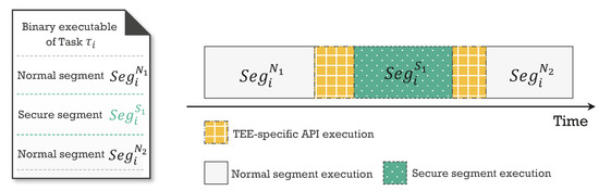 We assume a set of independent sporadic real-time tasks running on a single TrustZone-enabled processor, which can switch between Secure and Normal World through a Secure Monitor Call (SMC) instruction. In addition, the executing code of each real-time task is given in the form of code segments, where and are the code segments executing in Normal World, and is the code segment executing in Secure World. As shown in Figure 2, for a task with TEE requirements (i.e., executing a few code segments in Secure World), segments and are interleaved by segment . TEE-specific APIs are invoked before and after each secure execution segment to bridge the communication with normal execution segments. Similarly, if a task does not require services in TEE, it only has a single normal execution segment .