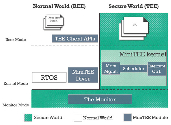 Figure 4 illustrates the overall architecture. At the core lies the two basic software components—MiniTEE-driver and MiniTEE. MiniTEE-driver, placed within a Normal World RTOS, provides an interface for real-time tasks to leverage MiniTEE. The main components of MiniTEE are the Monitor and MiniTEE kernel. The Monitor is responsible for the switching between the Secure World and the Normal World, including saving and restoring the context of the corresponding world, passing control-related command and data. The MiniTEE kernel is responsible for providing the fundamental core services, such as TEE task management, memory management and interrupt handling.