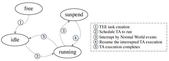 To manage the run-time information, MiniTEE kernel keeps track of each TEE task by maintaining a TEE task control block (TTCB). TTCB holds the state and owner of the TEE task, a data buffer to store passing message data from Normal World in shared memory, pointers to the entry of current executing TA, to the bottom of the stack space using to store local variables of its calling TA(s). The status may fall into one of the following four states: free, idle, running, and suspend and the state transformation flow is described in Figure 6. Since a TEE task just acts as the proxy in MiniTEE of a Normal World real-time task. Once MiniTEE decides to response a request from real-time task , a will be created and the corresponding attribute owner is set to . Thereafter, is used to handle all the requests from task .