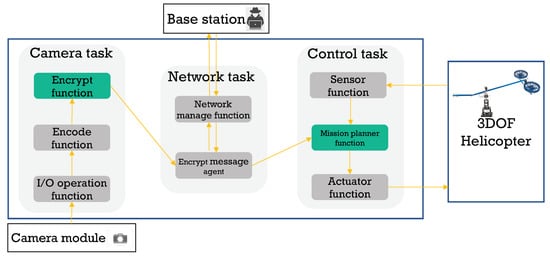 Camera task is used for image processing. The I/O operation function mimics the behavior of a camera driver; to perform repeatable experiments, our system simply places a fixed set of images into a Memory File System (MFS) and extracts them in order. The encoder function is realized as a JPEG compressor. Encryption function uses the AES ECB cipher using a protected, secret 128bit key. The encrypted image is then passed to the encrypt message function in Network task. Network task is responsible for communicating with base station. The encrypt message function, on the one hand, receives encrypt data from Camera task then pass them to the base station via network manager function, on the other hand, receives encrypted set-point value from base station and send to Control task. Control task is responsible for the control subsystem. The sensor function receives and parses incoming sensor data for the other tasks. The mission planner function computes the control output based on measured sensor data, them move the 3DOF towards the set-point parsed by decrypt function. Finally, the actuator function prepares the actual output commands and send them to physical actuators.