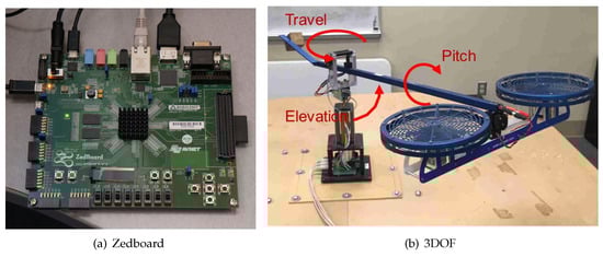 Our control system runs on one of the processor cores on ZedBoard (shown in Figure 8a). The 3-Degree of Freedom (3DOF) helicopter (displayed in Figure 8b) is a simplified helicopter model, ideally suited to test intermediate to advanced control concepts and theories relevant to real-world applications of flight dynamics and control. It is equipped with two motors that can generate force in the upward and downward direction, according to the given actuation voltage. It also has three sensors to measure elevation, pitch, and travel angle as shown in Figure 8b). All three tasks are implemented on FreeRTOS (v 10.0.2) under 0.1 ms sysTick rate. And the communication among those three tasks can use non-blocking queue API provided by FreeRTOS kernel to avoid long blocking times. As the baseline, all the sub-functions in the whole task set run in the normal world without ARM TrustZone enabled. For the MiniTEE version, the sub-functions wrapped with green blocks (as shown in Figure 7) are treated as TAs running in secure world.
