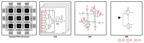 Field programmable gate arrays (FPGAs) are a type of semiconductor device that can be reconfigured by register transfer level (RTL) designers to realize target functionality. A typical FPGA conceptually consists of a tile of three major blocks [1,2], configurable logic blocks (CLBs), input/output blocks (IOBs), and switch matrices (SMs), as shown in Figure 1. CLB is a primary resource to realize target logic function. Each CLB is decomposed into several SLICEs, each of which contains look-up-tables (LUTs), flip-flops (FFs), and multiplexes (MUXs). In addition, IOBs are responsible for controlling external connectivity and SMs provide configurable internal connectivity between the CLBs and IOBs within the FPGA. It is important that the configurability of FPGA originates from values that are stored in programmable points [1,2] such as programmable logic points (PLP), programmable interconnect points (PIP), and programmable content points (PCP), denoted as bold red boxes in Figure 2. According to the values stored in the programmable points, a FPGA is allowed to provide various logical functionalities as required by the RTL designer intends. Due to the programmable nature, FPGAs have been widely adopted for many fields of the embedded systems, including consumer electronics [3], communication systems [4], automotive vehicles [5], and defense industry applications [6].