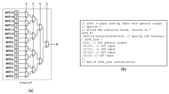 Furthermore, Xilinx provides primitive libraries [30,31] of LUTs written in hardware description language (HDL) to help RTL designs to instantiate LUT. Figure 2b depicts the primitive library of 4-input LUT with the name of LUT4, the inputs of I3, I2, I1, I0, the output of O, and the initial value of 16-bit INIT. The LUT contents computed from the target logic function is initialized as a 16-bit INIT parameter. When INIT is initialized as 16’b0010_1010_0000_1010, the 4-input LUT operates the logic function .