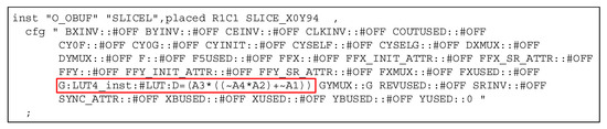 To solve this problem, the proposed method employs Xilinx Design Language (XDL) [34,35], which describes the utilized hardware components for the current target design among the entire hardware resources in FPGA. In Xilinx ISE Design Suite, XDL [34,35] is generated automatically to provide the RTL designers for verifying the target design’s synthesis and optimization. Figure 5 shows the example of XDL [34,35] captured from Xilinx Spartan-3. The red box in XDL [34,35] indicates that the current design instantiates LUT4 whose internal Boolean function is (A3((~A4 * A2) + ~A1)) when synthesizing a 4-input LUT with target function . As previously descried in Section 2, the actual configuration of LUT in Figure 3 is not the same as the ideal LUT in Figure 2a.
