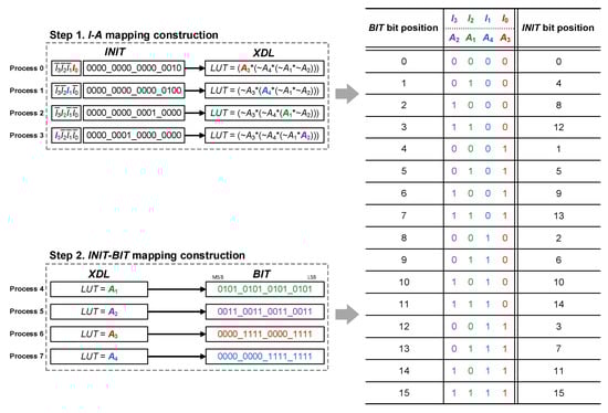 Since an LUT cannot be implemented with a single input Ii (0 ≤ i < N) due to practical reasons, the proposed method instantiates a specific form of I = IN-1IN-2…I1I0 that can distinguish the relation between input variable Ii (0 ≤ i < N) and internal variable Aj(1 ≤ j ≤ N). More precisely, I sets to the combination of single and other . For instance, 4-input LUT is instantiated with , , and . Using this specific form of I and corresponding XDL [34,35], a feasible solution is provided to map input variable Ii (0 ≤ i < N) and internal variable Aj(1 ≤ j ≤ N). As an example, Figure 6 shows that input I of , , and are initialized in the target LUT with a different 16-bit INIT vector, resulting in different XDLs. Based on the input I and XDL [34,35] described in Figure 6, pairs of (I0, A3), (I1, A4), (I2, A1), and (I3, A2) are recovered. Thus, N-input LUT demands N processing to completely build the I–A mapping table.